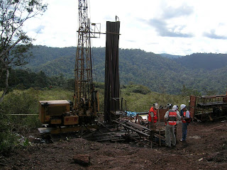 After lunch at mine cafeteria (courtesy CVRD), we drove to several sites on a canga-covered plateau. "Canga" is a Brazilian turn for a type of deeply-weathered surface layer. As high volumes of rainwater percolate down into the ground, mobile elements are gradually stripped from upper layers, leaving a leeched cover of deeply weathered material. Anyway, on this particular plateau, Giliberto is overseeing systematic drilling program. The company is having drill cores extracted every 100 meters in a gridded pattern. Although time-consuming and undoubtedly expensive, such an intensive drilling program allows mining geologists and engineers to construct a highly detailed view of the subsurface rock strata and allows them to focus their efforts on the most worthwhile areas. Late in the afternoon we retired back to the field office to plan for the next day.